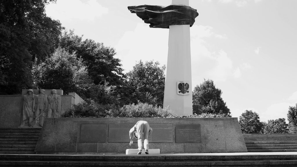 Der Titel Ein direktes Vorbild körperlichen Einsatzes ist der Bauakte des Berliner Denkmals für die Interbrigadisten entnommen. Für das Denkmal schuf der Bildhauer Fritz Cremer eine Bronzefigur, ein Kämpfer im Soldatenmantel, die sich im Sprung befindet. Für meine Videoperformance suchte ich verschiedene vergleichbare Orte in Berlin auf.